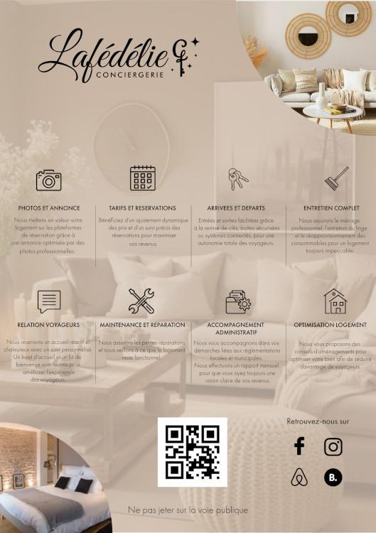 La Conciergerie Lafédélie bénéficie aujourd’hui d’une image harmonieuse et haut de gamme, en parfaite adéquation avec ses valeurs : authenticité, confiance et qualité. L’ensemble des supports — logo, site et flyer — contribue à renforcer sa notoriété et à inspirer la confiance de ses clients et partenaires.